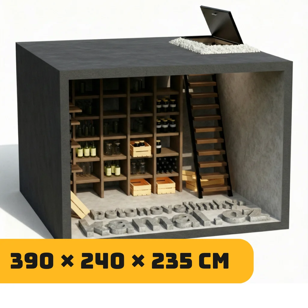 33 000,00 Kč Betonový sklep s plochou střechou a vstupem na kratší straně - (390x240x235cm)